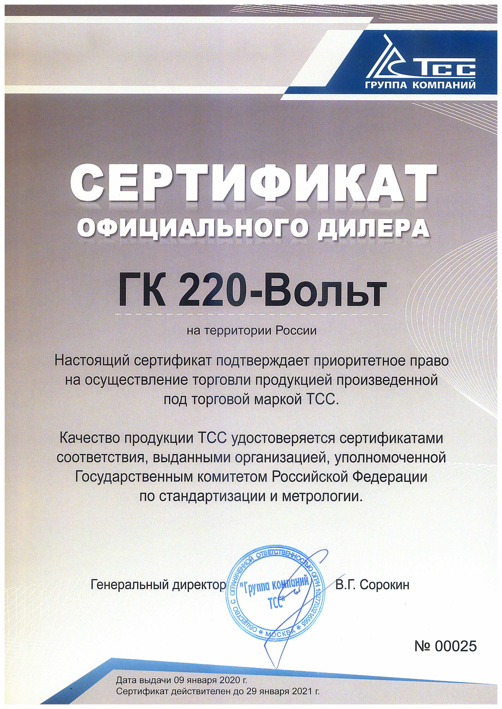 Востребованность оборудования ТСС государственными структурами — видимый показатель надёжности продукции. Кроме того, она обладает 14 сертификатами качества. Гарантия — 12 месяцев.